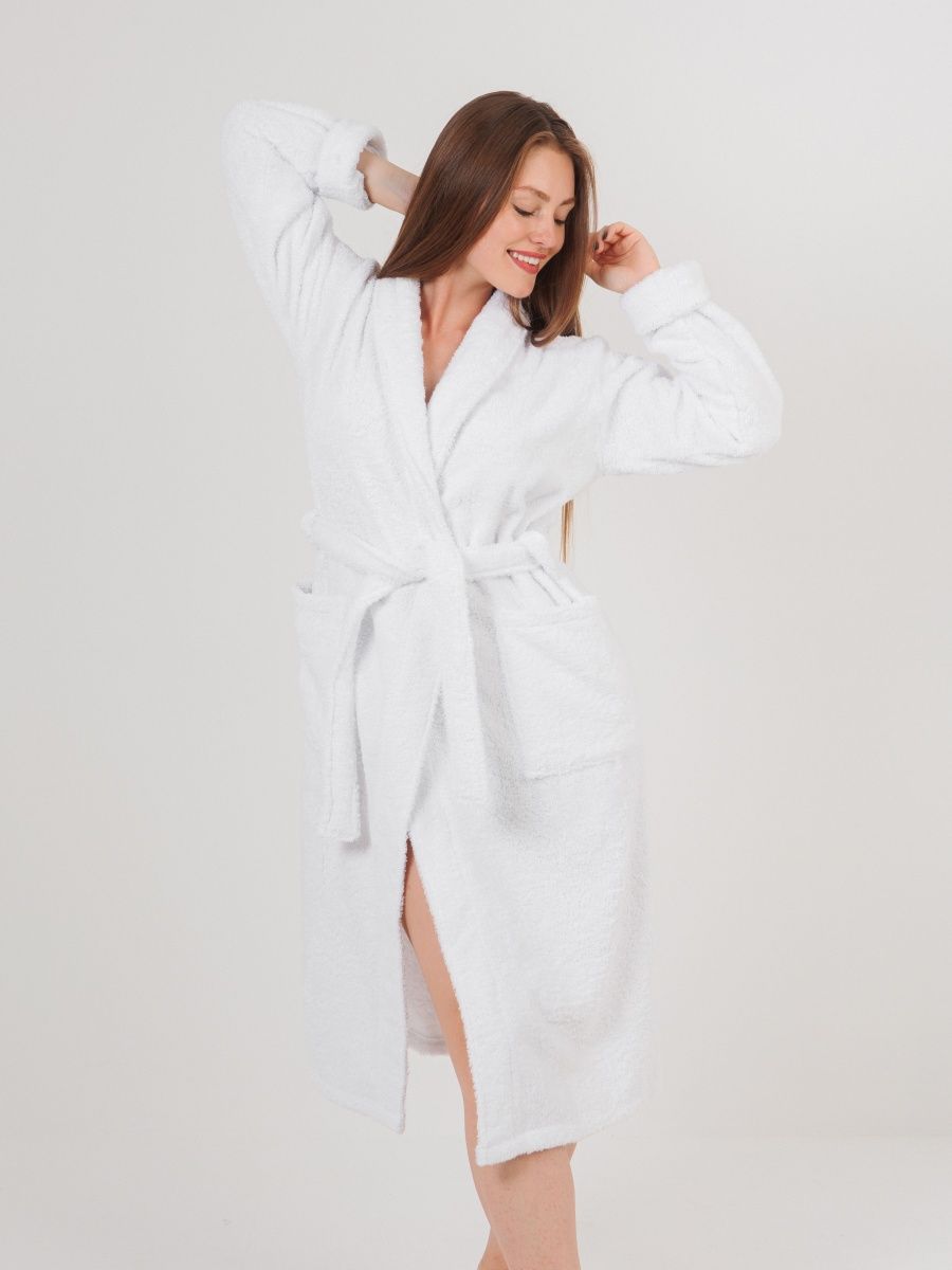 Женский белый махровый халат с воротником шалька,изготовлен из 100% хлопка, выращенного в экологически чистых регионах.